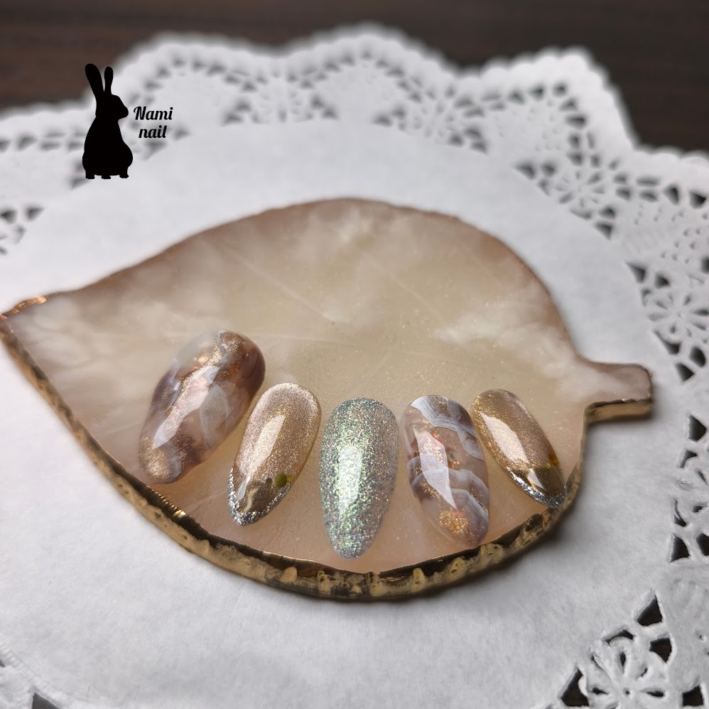 マグネットジェルを乗せて、キラっとさせた天然石風のデザインやってみました。